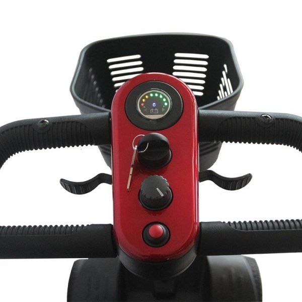 El asiento acolchado es giratorio 360º que activa una palanca en la base, los reposabrazos son abatibles, ajustables y extraíbles. Manillar "delta" ajustable y con marcador lumínico de batería. Tiene un bloqueo en la dirección para su transporte/medida antirobo. Las baterías están dispuestas en el interior de la maleta bajo el asiento. Esta maleta se puede extraer sin sin necesidad de herramientas para hacer la carga fuera del scooter.
